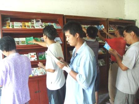 安徽农垦龙亢农场作为国家社会主义新农村建设的联系点,充分发挥科技带动作用,将农业部赠予的400册科技种、养殖图书摆上农场阅览室的书架上,并将科技实用书的目录印发给职工及周边的农民。图为职工和周边农民在借阅图书。