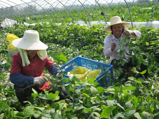 5月20日下午,皖河农场新光分场农工正在大棚里采摘毛豆。这是农场500亩钢架大棚蔬菜基地今年首茬蔬菜——东北毛豆上市。大棚与露天互动、总面积1300亩毛豆,总产量约1500吨,自5月19日前后大批供应安庆农贸市场,缓解了该市“菜篮子”市场供应。由于首茬种菜,受土壤、气候等因素影响有所减产,单产500公斤,安庆市场价每公斤6.5元,亩效益3200元,亩均纯收入1500元左右,相当于棉花和油菜全年两季纯收入。另据了解,农场蔬菜基地毛豆还将供应上海、杭州等重要城市。(王洪 摄 )