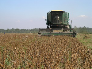 10月8日上午,艳阳高照,秋色正浓.在潘村湖广褒的 原野上,机械轰鸣,车来车往,2005年秋收会战全面 打响了.在三分场8号地北,3台大型联合收割机来回 穿梭,已经熟透的大豆随着收割机的传送装置一路 欢唱着奔向机仓.不到半天时间,这一块大田就基本 收割一空.晒场上,一车车金灿灿的大豆运来了,妇 女们麻利地卸粮摊晒,大伙边劳动边拉呱,十分热 闹.分场领导分片负责,检查作业质量,维持收割秩 序,协调收割和运输机械,时时提醒职工不忘安全生 产.8日一天,全场投入收运机械近300台,到下午5 时,收获大豆7190亩,加之前期收获部分,已经完成 收割任务的44%%.9日开始,秋收进入高潮阶段,全场 仅各型收割机就投入近200台,汽车、轮式拖拉机等 运输车辆300多辆,各家庭农场除老弱病幼外悉数 上阵,全力以赴战秋收。至11下午,全场3.2万亩全 部收割完毕,圆满完成了今年秋收任务。