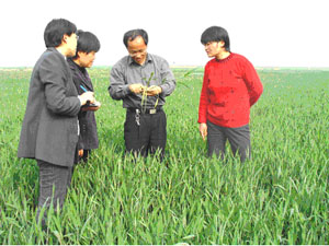 龙亢农场依靠科技抓田管,定期组织科技人员深入 家庭农场指导生产,并将田管措施和病虫害防治印 发成册下发到每个家庭农场,将春季田间管理落到 实处。(图为科技人员在指导田管)(龙亢农场场 长工作部 王戴群)